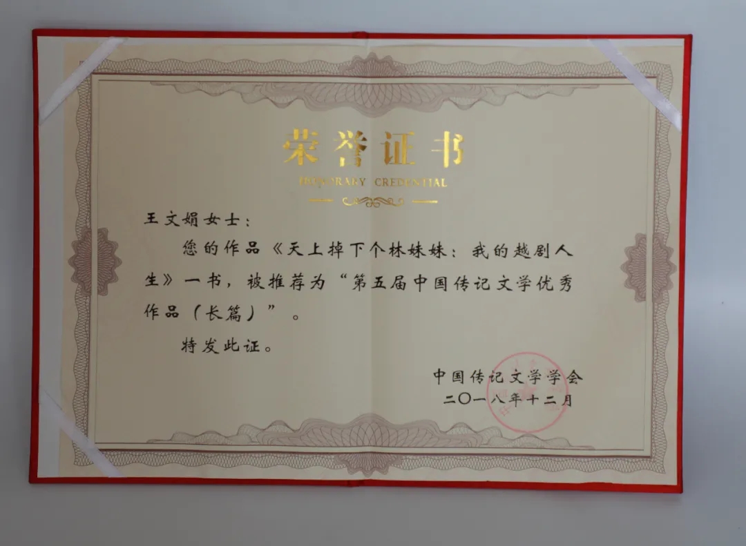 2018年,王文娟耗时六年潜心写作的自传《天上掉下个林妹妹——我的越剧人生》荣获“第五届中国传记文学优秀作品奖(长篇)”。