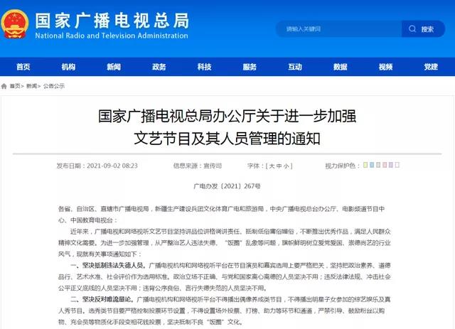 国家广播电视总局网站9月2日发布《国家广播电视总局办公厅关于进一步加强文艺节目及其人员管理的通知》。为进一步加强管理,从严整治艺人违法失德、“饭圈”乱象等问题,旗帜鲜明树立爱党爱国、崇德尚艺的行业风气,《通知》提出八项要求,包括坚决抵制违法失德人员、坚决反对唯流量论、坚决抵制泛娱乐化、坚决抵制高价片酬等。